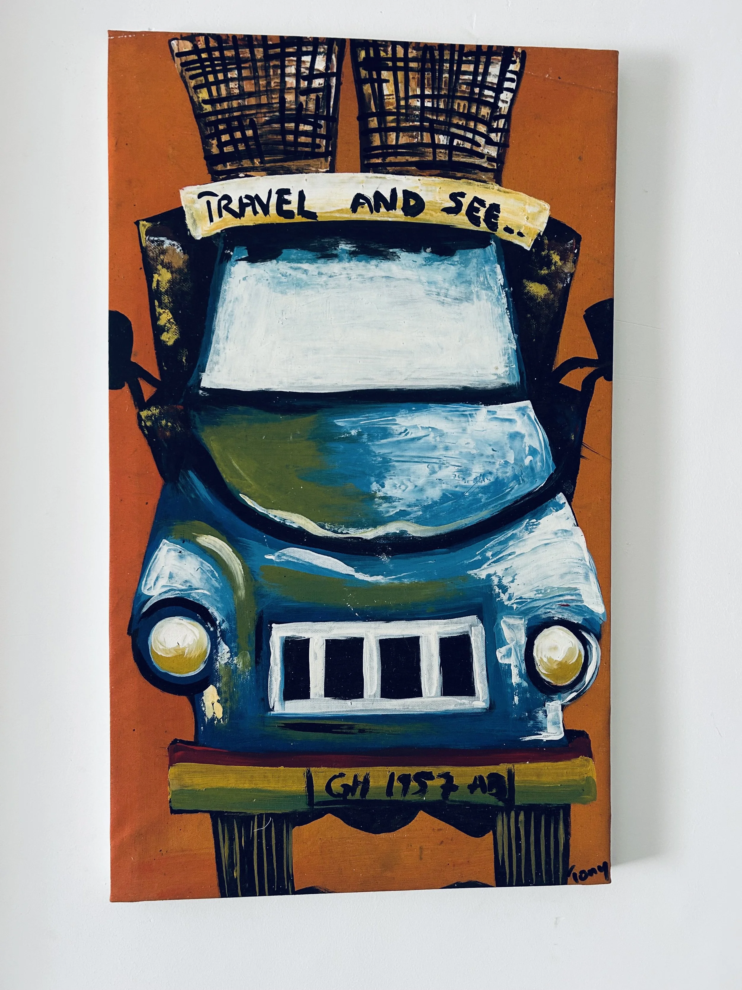 The second painting symbolizes a pivotal moment in Ghana’s history—the return of power to the people and the end of British rule in 1957. It captures the spirit of liberation and the newfound sense of freedom that came with independence. This era marked a time when Ghanaians embraced the ability to travel, explore the world, and shape their own future, reflecting a powerful narrative of empowerment and self-determination.