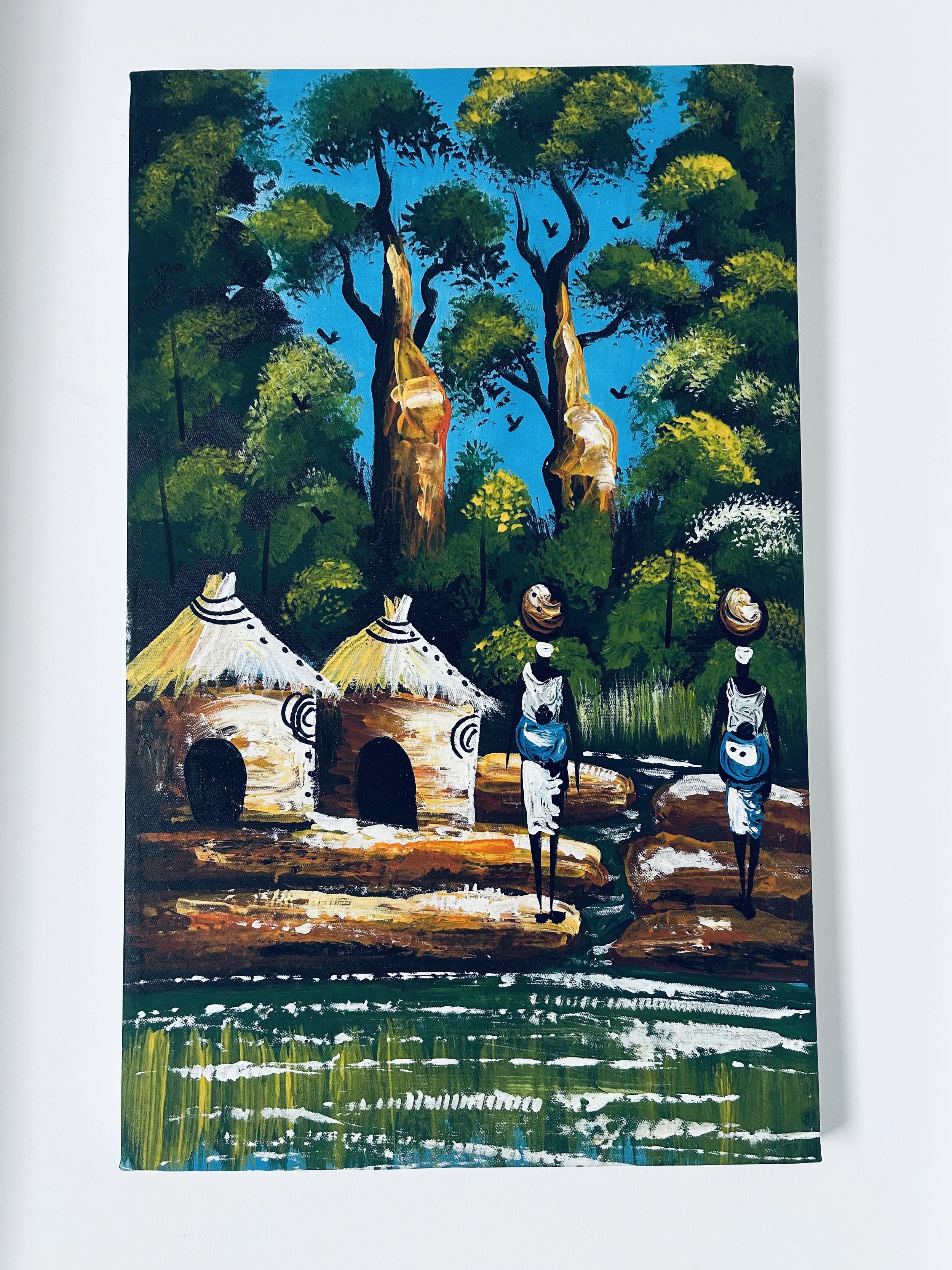 Enhancing the cultural depth of our home are two captivating pieces of artwork, each telling its own unique story. The first painting, mounted on stretched canvas, vividly portrays the essence of African village life, focusing on “the women”, who are at the heart of the community. As pillars of a matriarchal society, women hold an essential role within the home and beyond. The artwork beautifully illustrates two women carrying items on their heads, while cradling a baby in a sling their her backs, symbolising strength, resilience, and nurturing care.