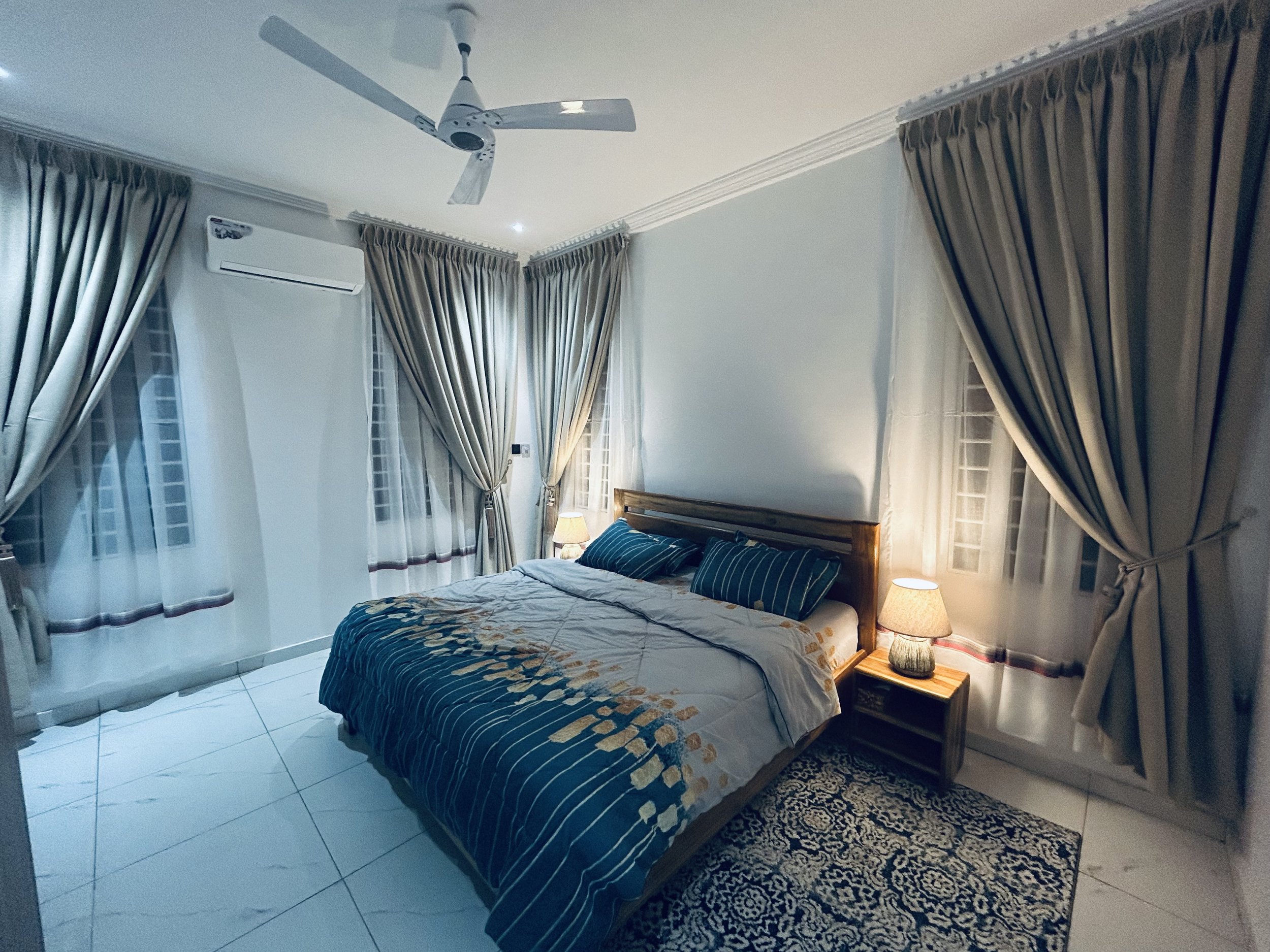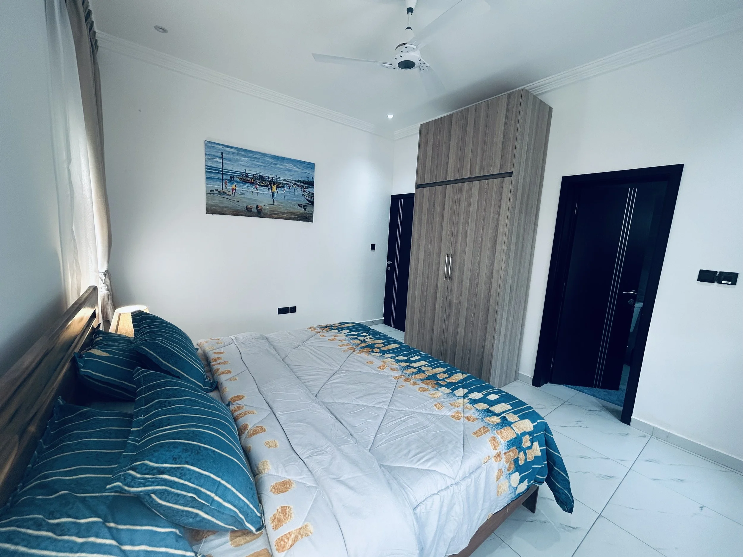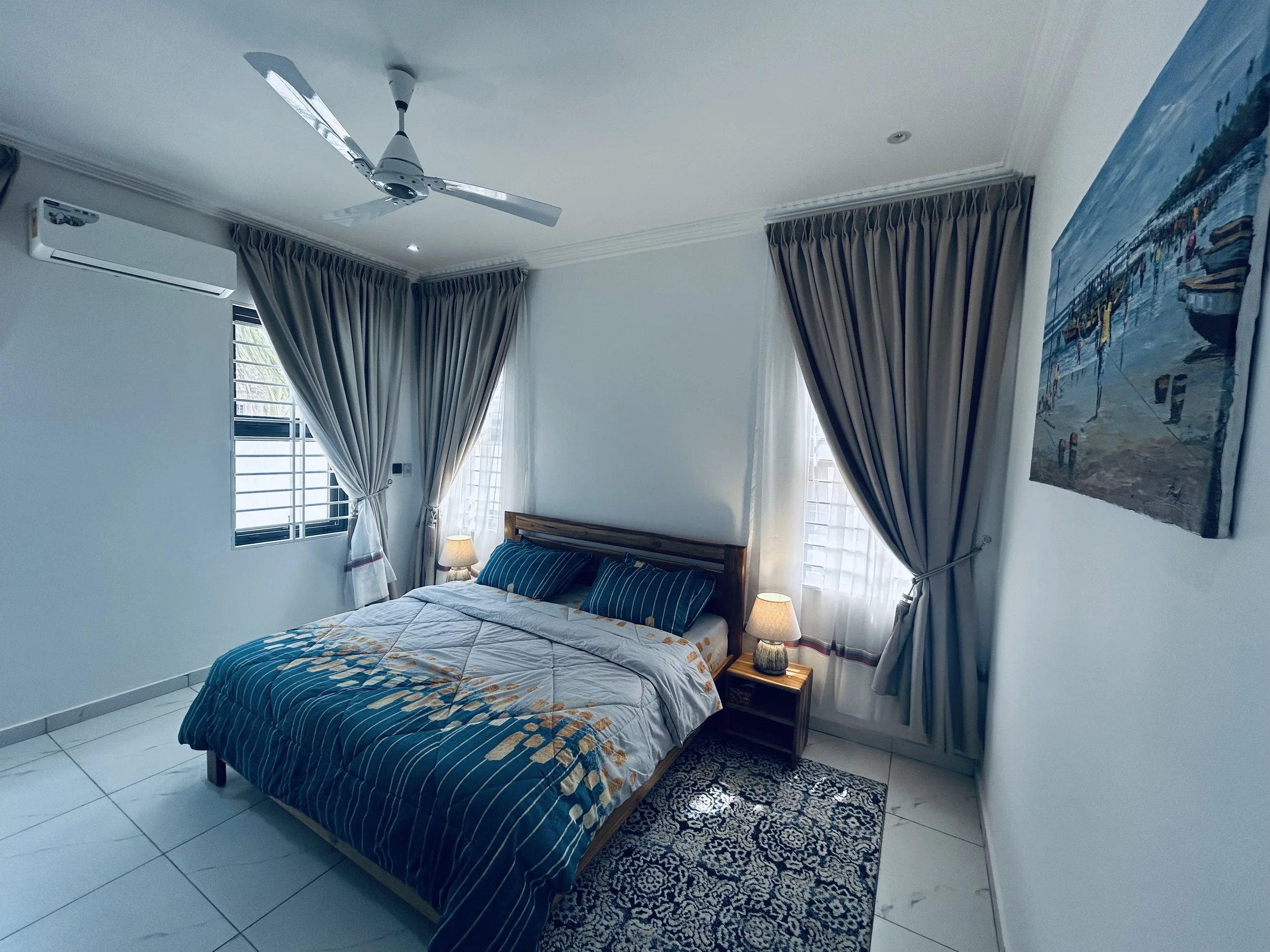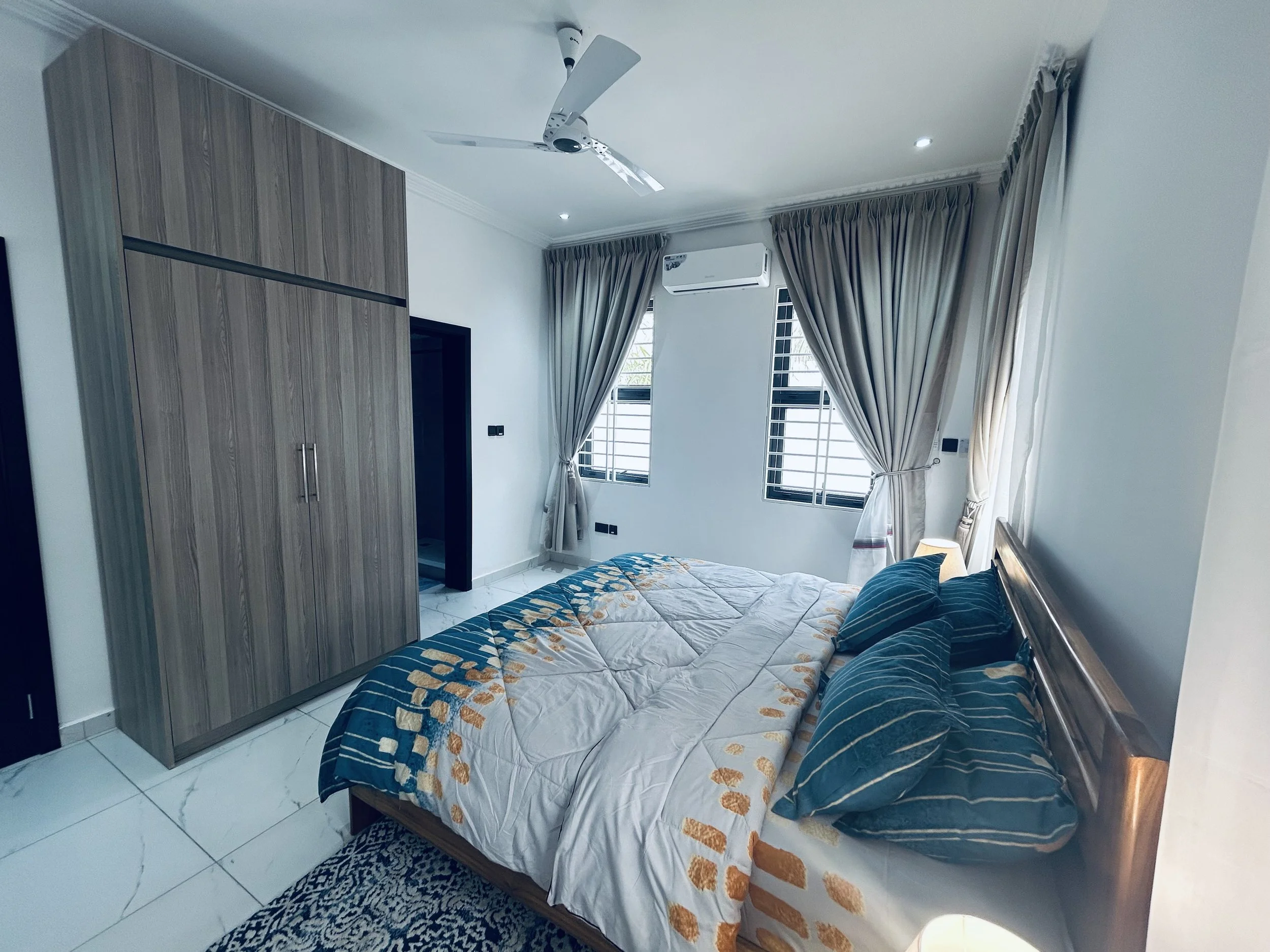 Bedroom 1, conveniently located on the ground floor, is tastefully furnished to ensure your nighttime comfort. The room features block-out curtains to keep out the heat and maintain a cool atmosphere, complemented by air conditioning for optimal comfort.