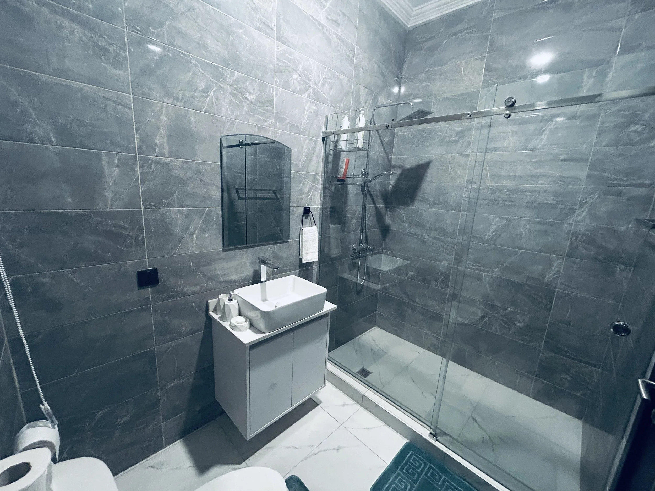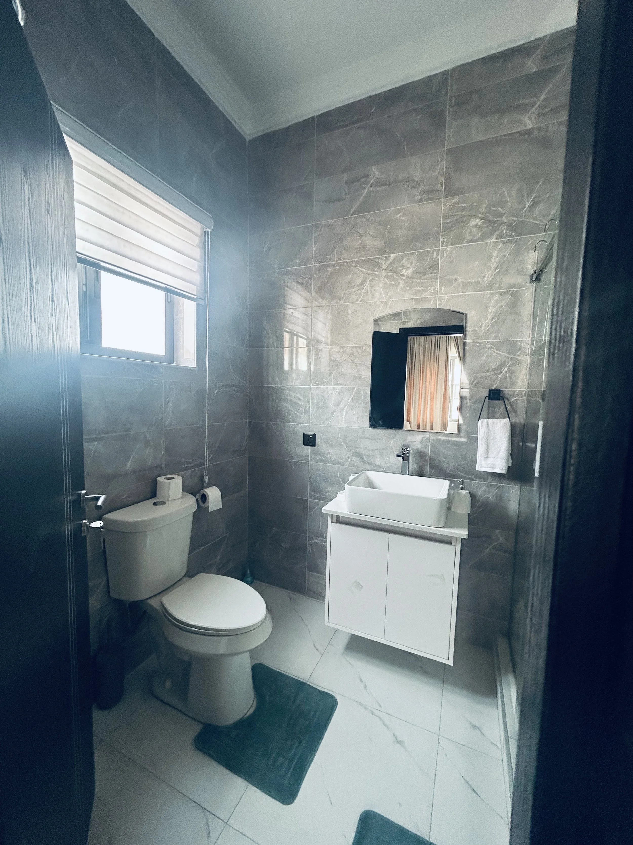 The bedroom also features a private ensuite with a toilet, shower, and washbasin, all stocked with fresh towels, soap, shampoo, and conditioner for your convenience.