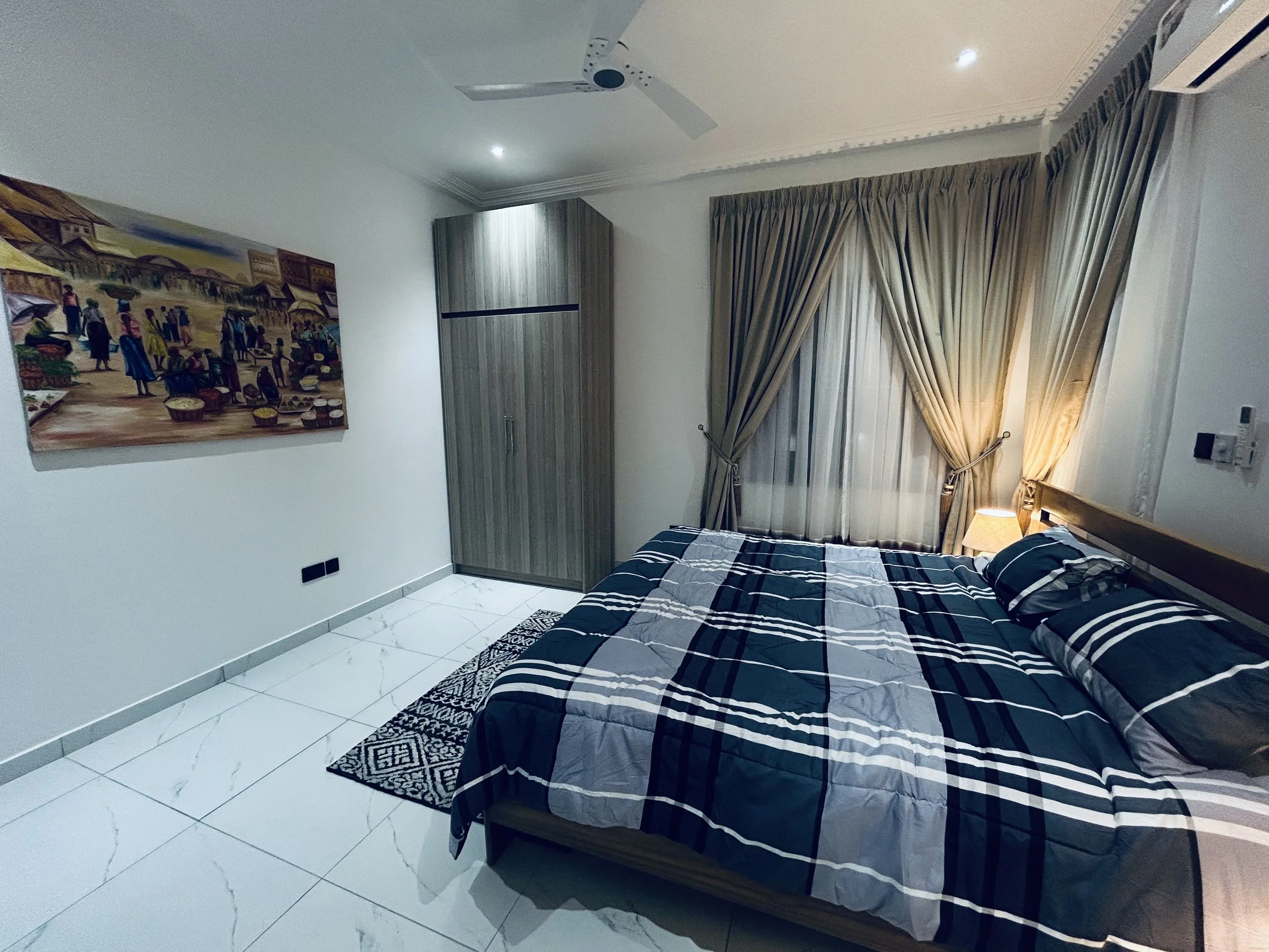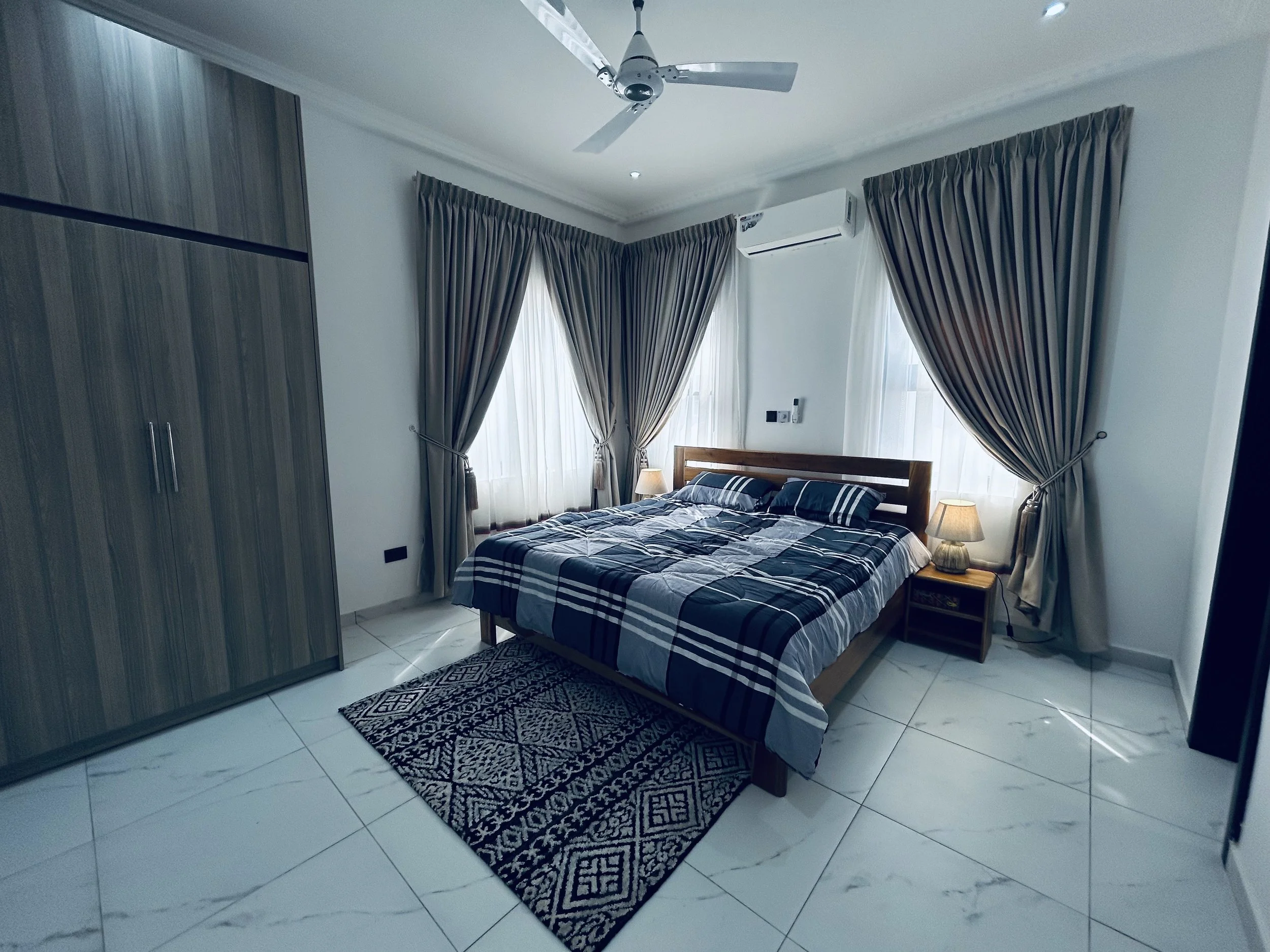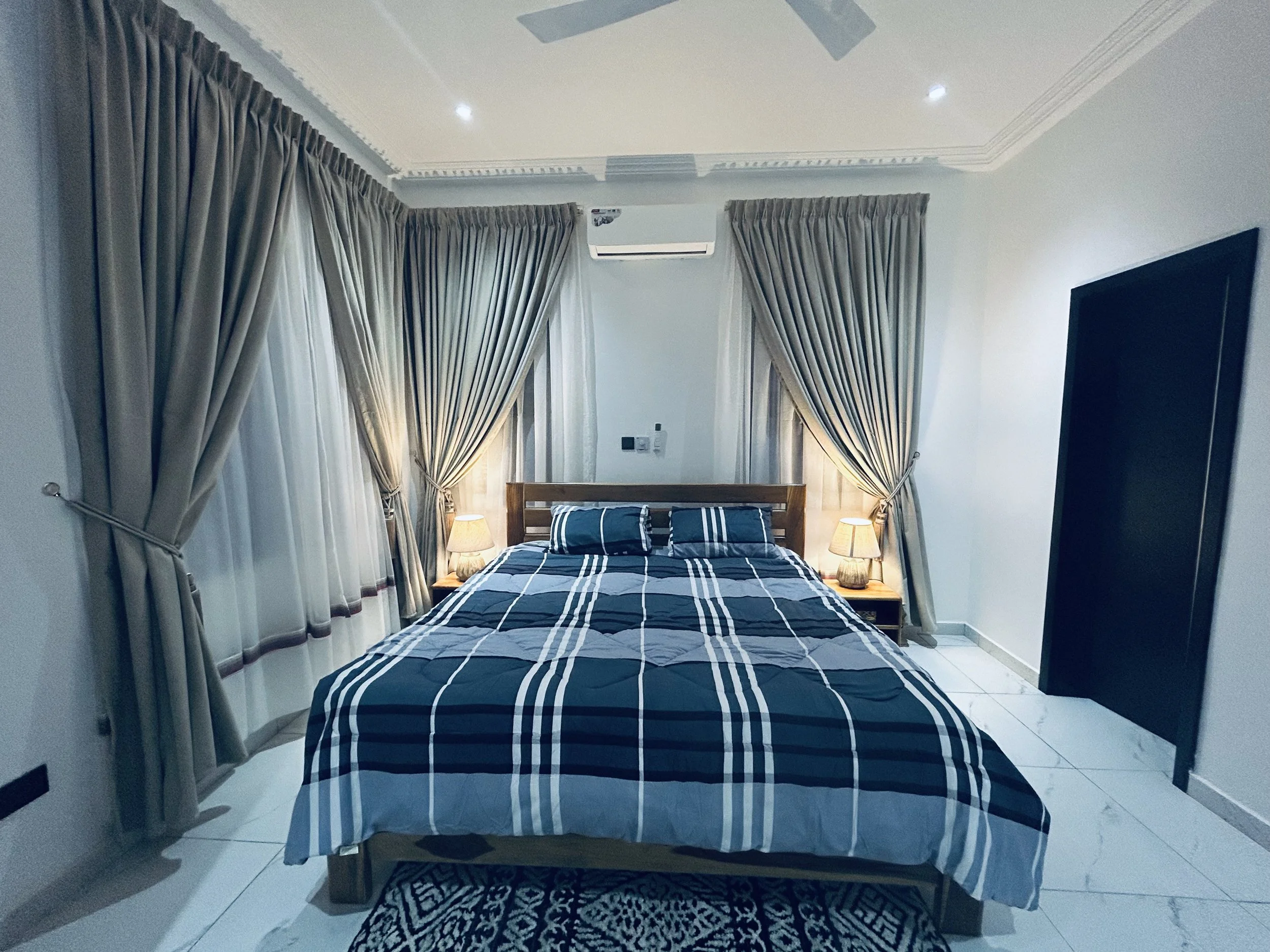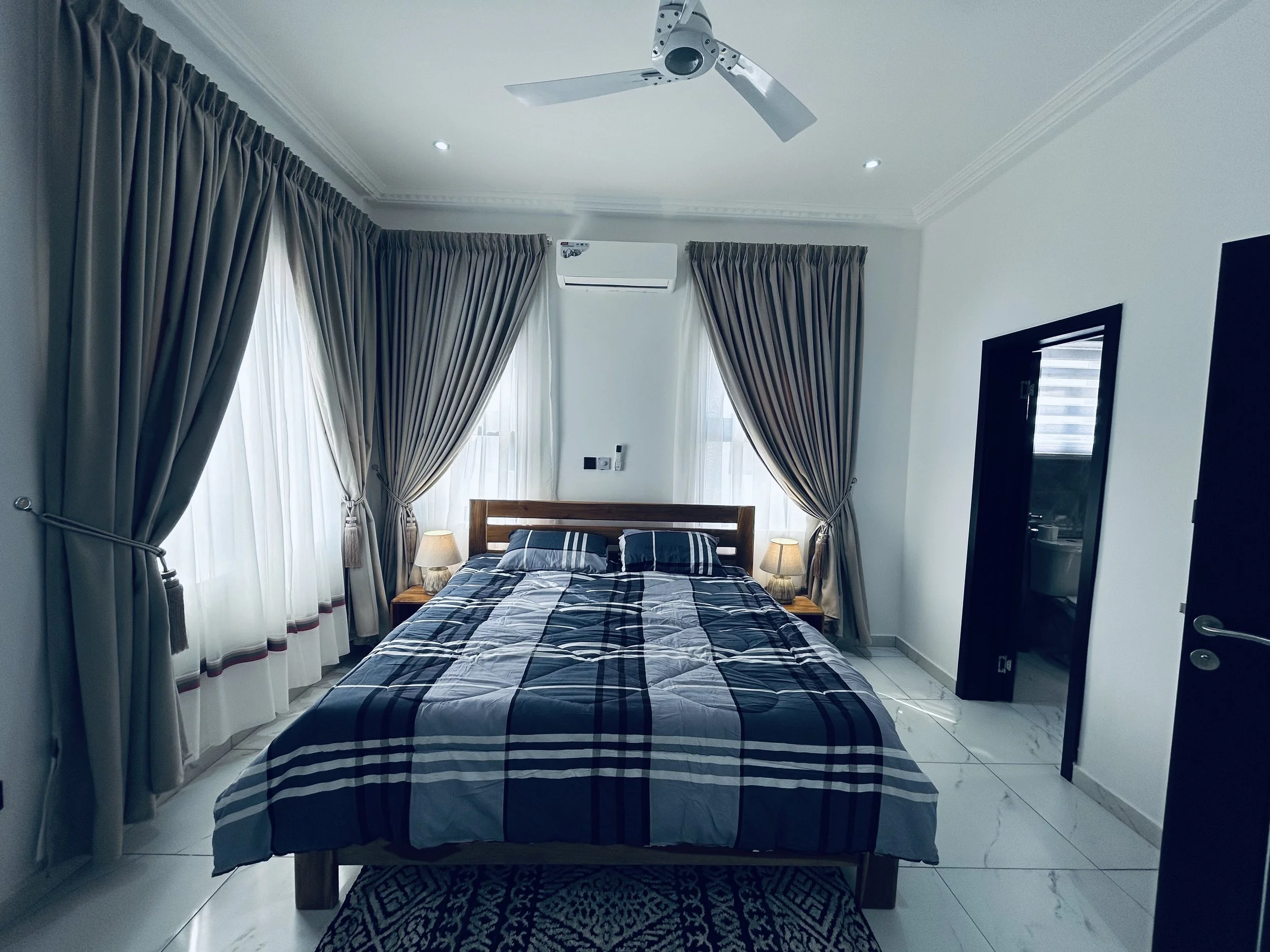 Bedroom 2, located on the first floor, is elegantly furnished to provide a peaceful and comfortable retreat. The room is equipped with block-out curtains to keep out heat and light, complemented by air conditioning to maintain a cool and relaxing atmosphere.
