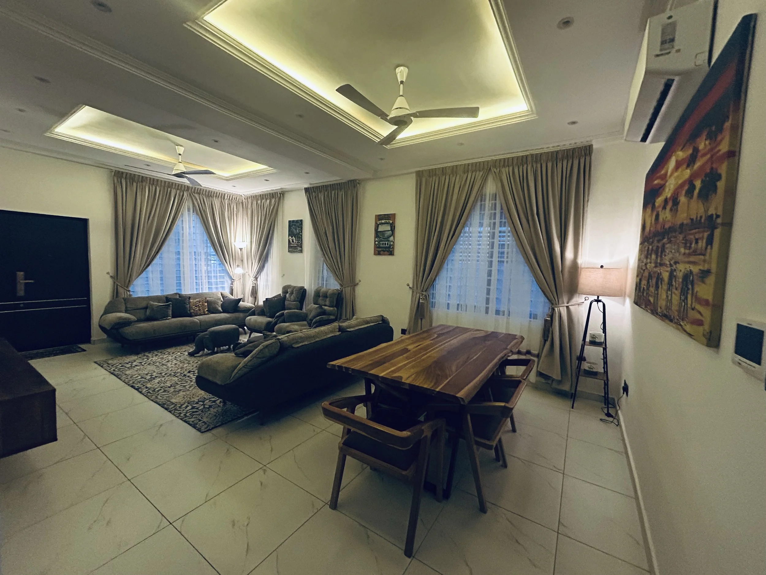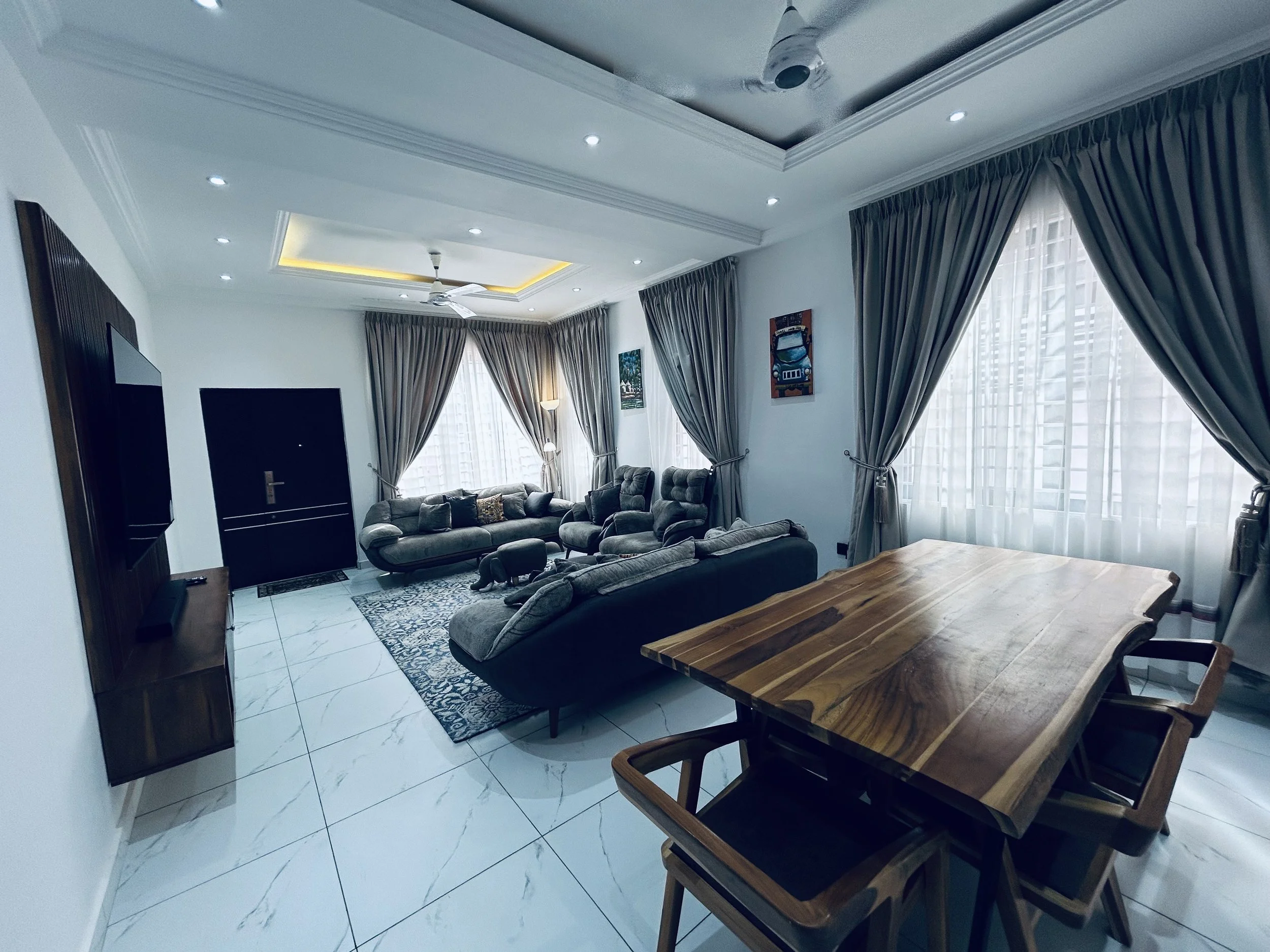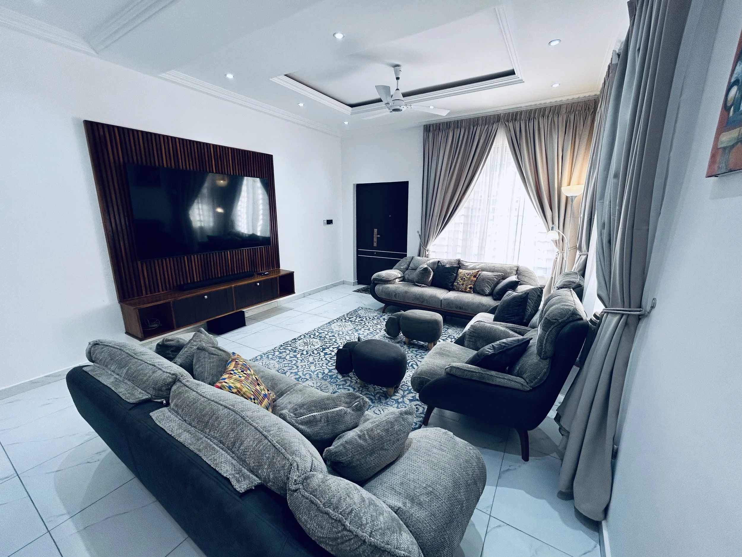 The living room is thoughtfully designed for comfort and relaxation. It features a modern lounge suite that comfortably seats up to eight people, offering plenty of space for gatherings or quiet evenings. A 75” TV paired with a high-quality sound system provides access to digital channels, YouTube, Netflix, and other popular entertainment apps for endless enjoyment. Block-out curtains help keep the room cool by reflecting the outside heat, while air conditioning ensures a consistently pleasant temperature.
