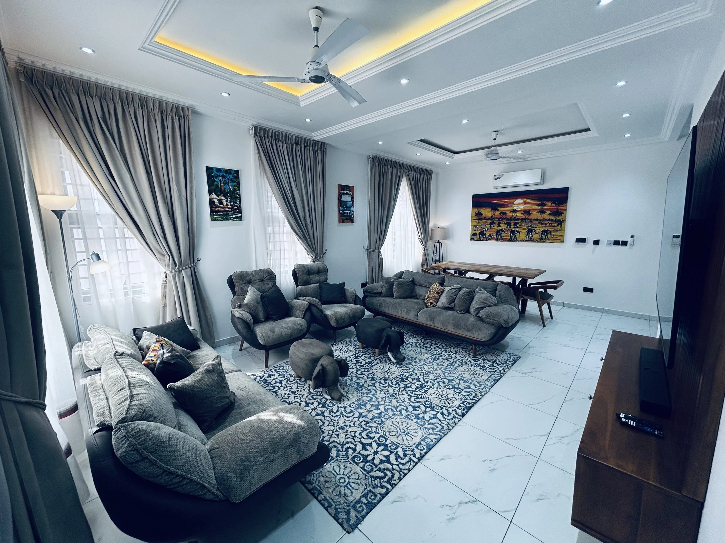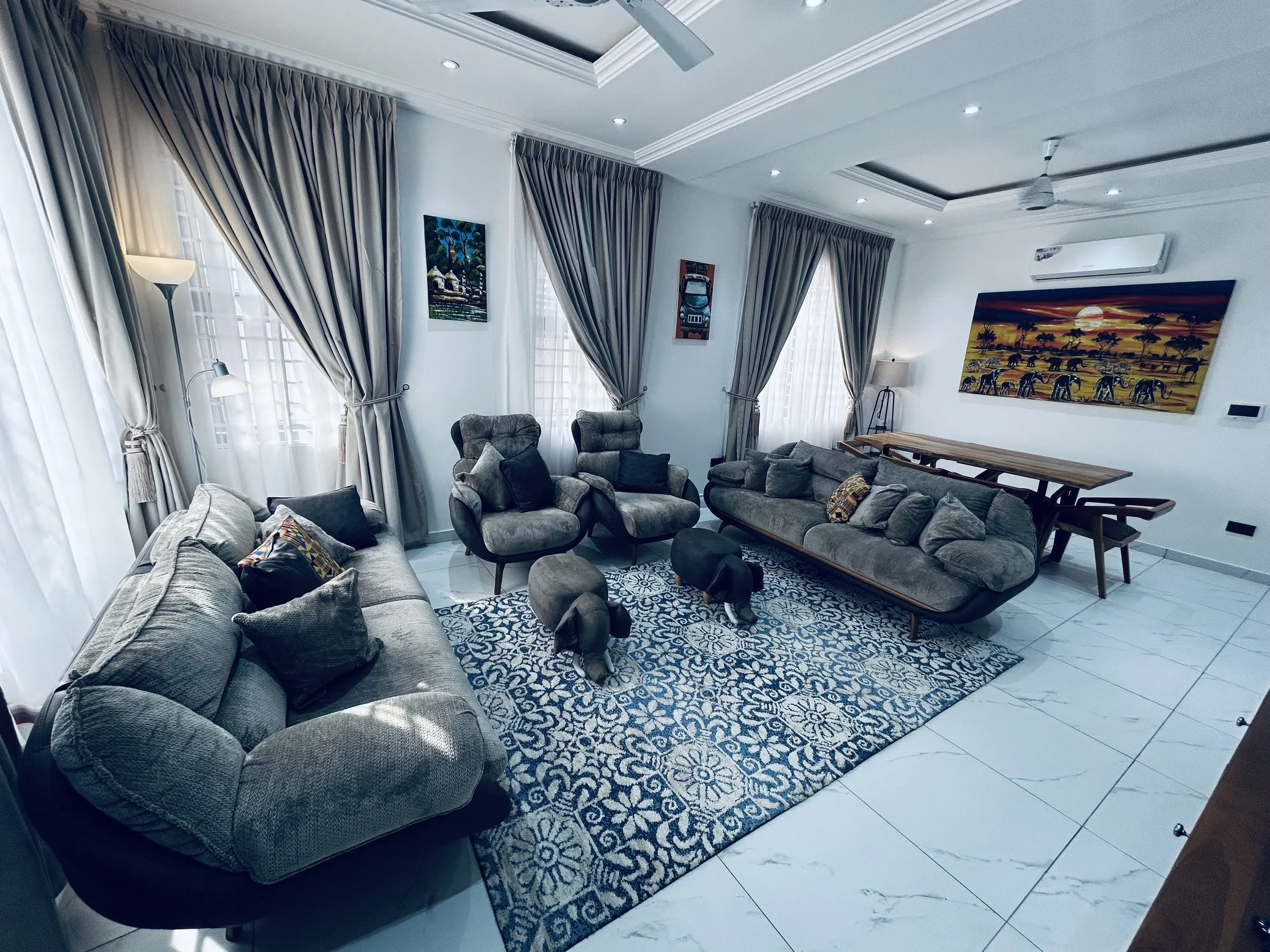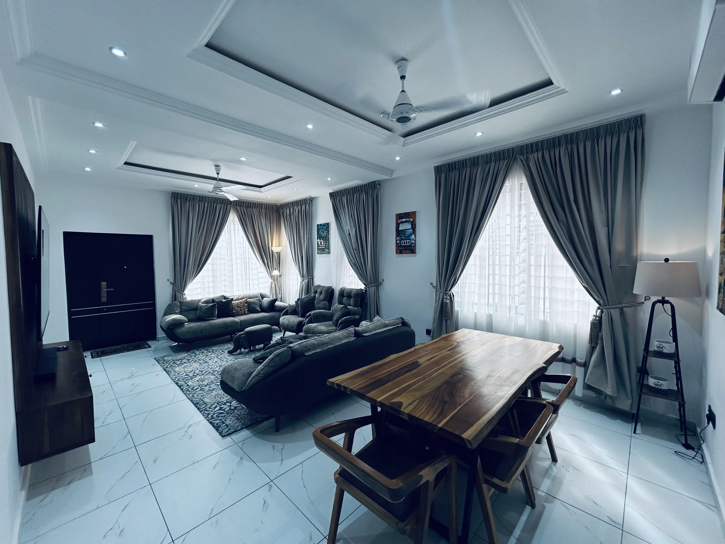The living room is thoughtfully designed for comfort and relaxation. It features a modern lounge suite that comfortably seats up to eight people, offering plenty of space for gatherings or quiet evenings. A 75” TV paired with a high-quality sound system provides access to digital channels, YouTube, Netflix, and other popular entertainment apps for endless enjoyment. Block-out curtains help keep the room cool by reflecting the outside heat, while air conditioning ensures a consistently pleasant temperature.