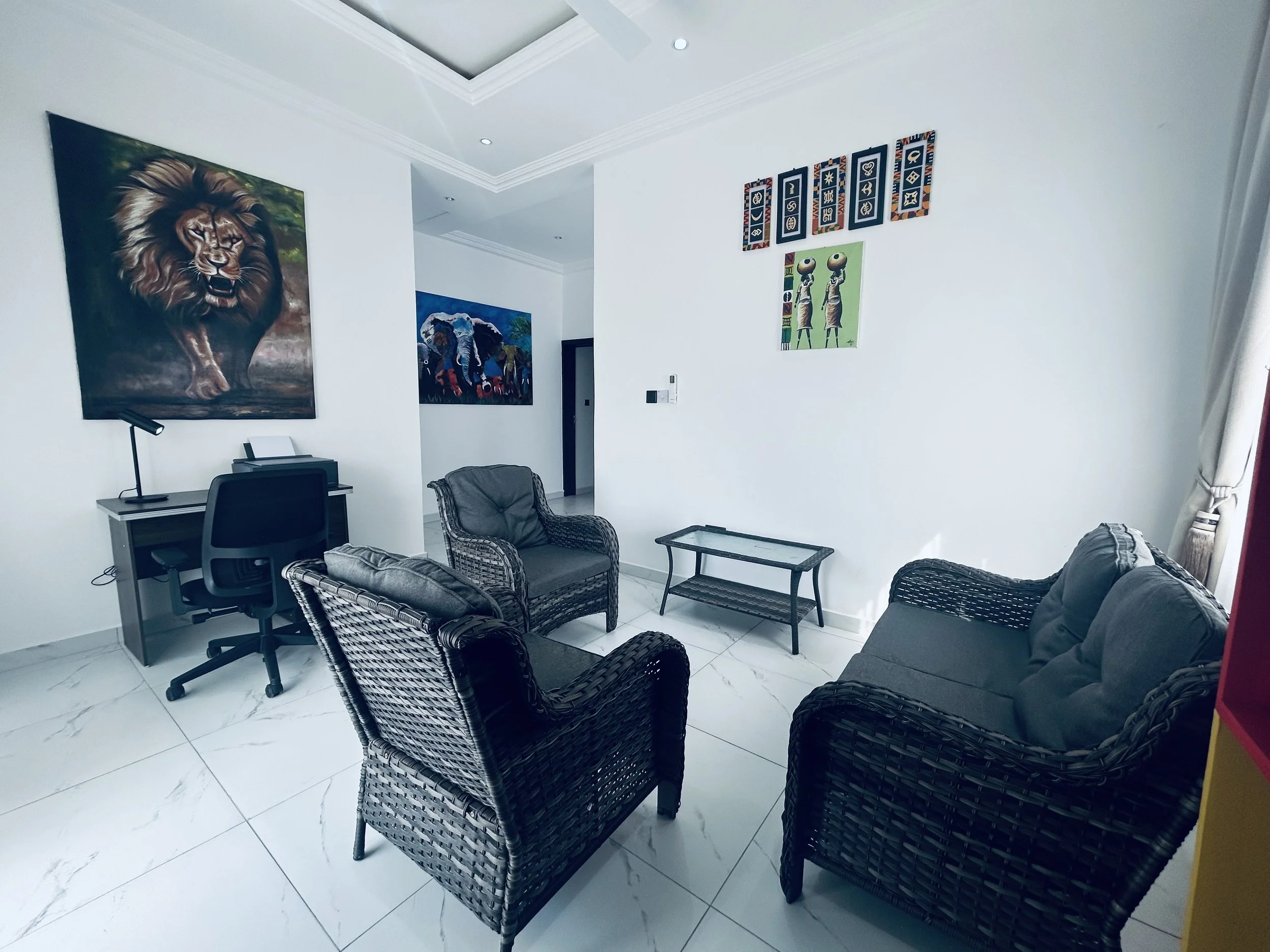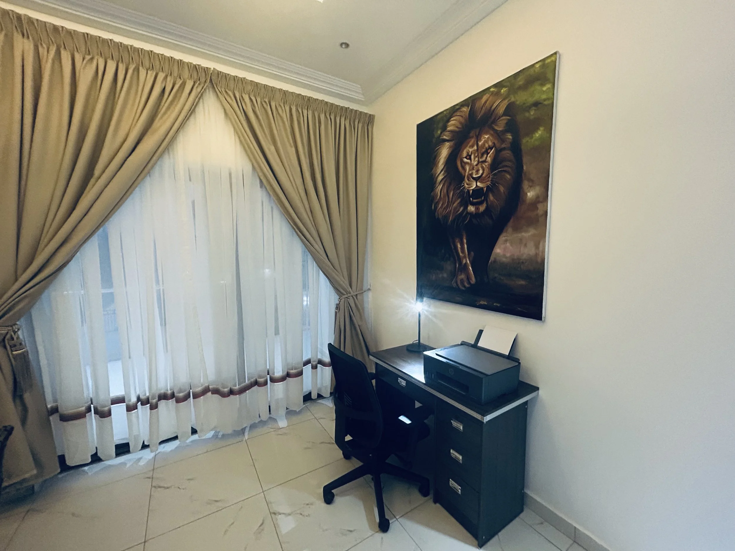 Upstairs features a stylish and functional living space, designed for both comfort and practicality. The inviting cane lounge suite creates a cozy atmosphere, seamlessly extending to a spacious deck that offers stunning views across the estate. The room is air-conditioned for year-round comfort and includes a dedicated office nook with a desk and printer. Thoughtfully arranged, the space can comfortably accommodate two couples in separate areas, ensuring both privacy and relaxation.